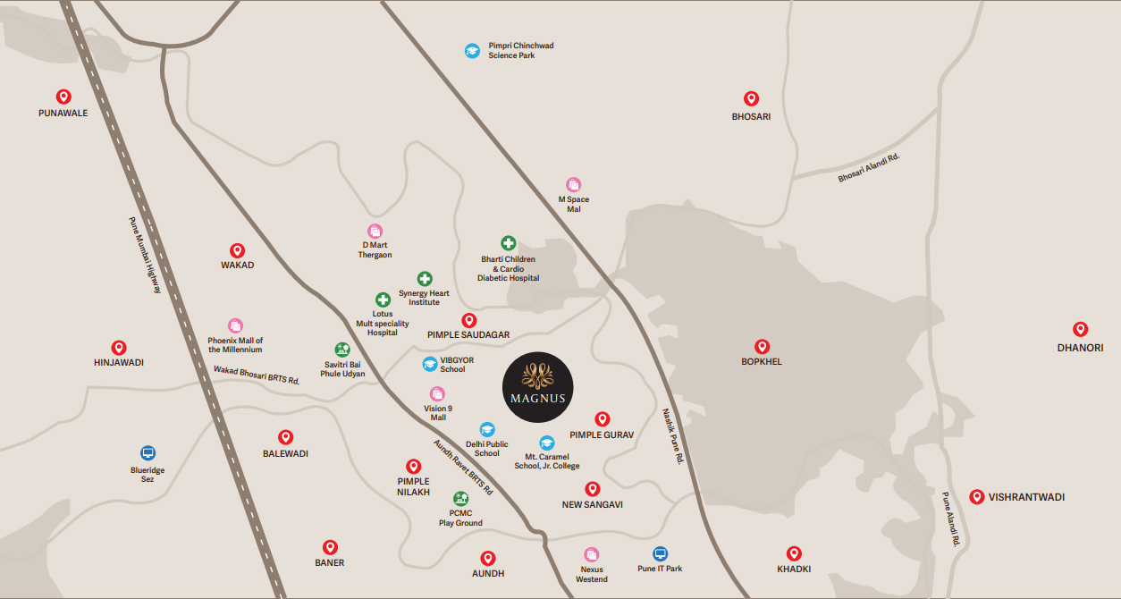 The Aswani Magnus location in Pimple Saudagar offers unmatched connectivity: just 5 minutes from Wakad and the Mumbai-Pune Highway, 10 minutes from Metro Station and top hospitals, and 20 minutes from Hinjewadi IT Park. Top-rated schools like VIBGYOR Rise (300 m), renowned hospitals like ONP Leela (900 m), and popular malls like Elpro City Square are all within easy reach.